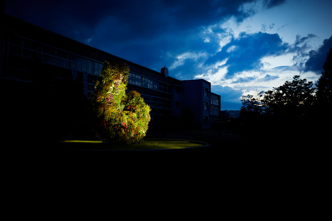 Incorporating around a hundred different types of flower, the work used a disused fountain at the school's entrance as its base. Taking the shape of a chrysalis, the sculpture was designed by Kanke Ayumi, then a pupil at the school. This was Azuma's first permanent botanical sculpture.