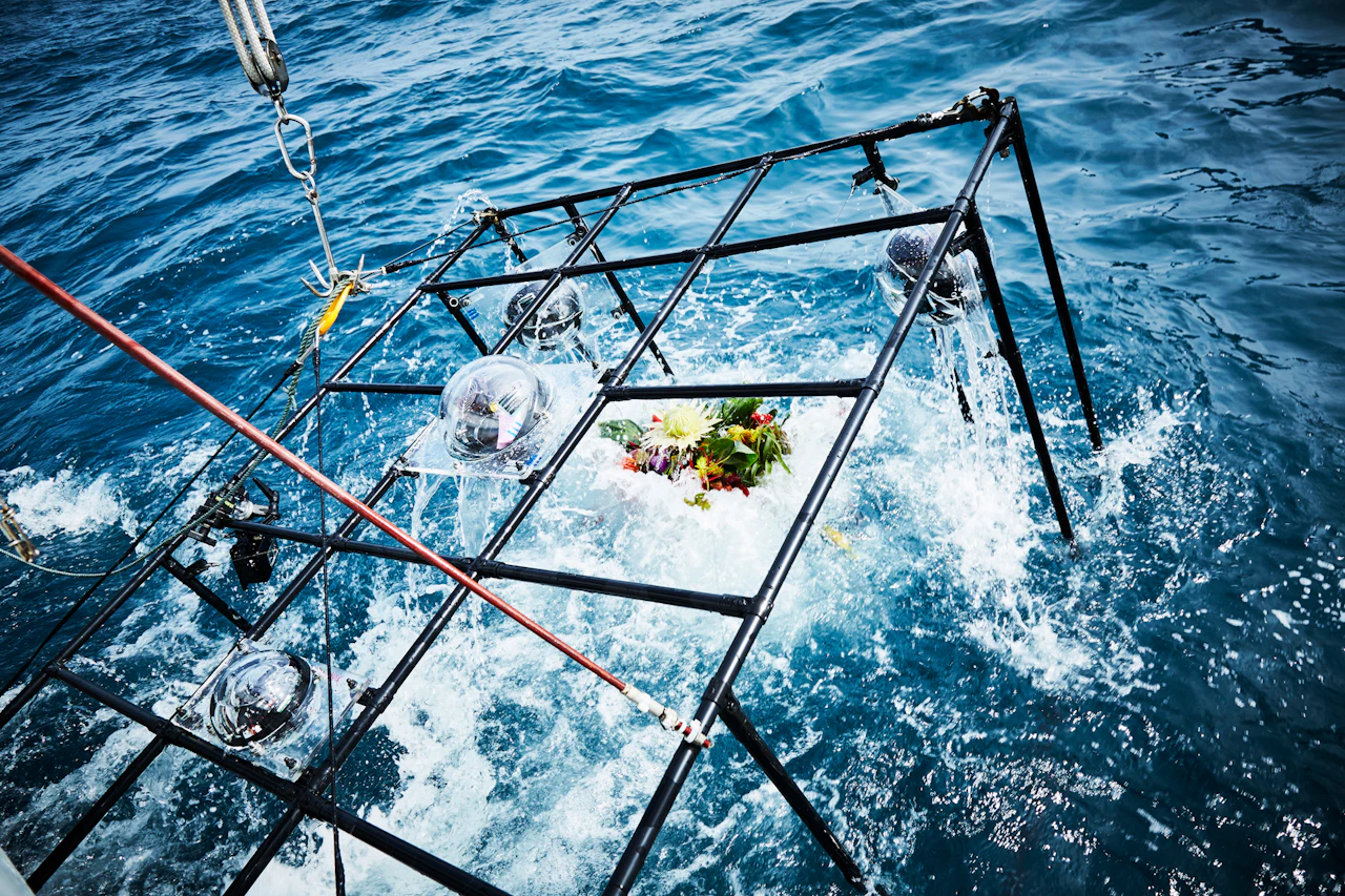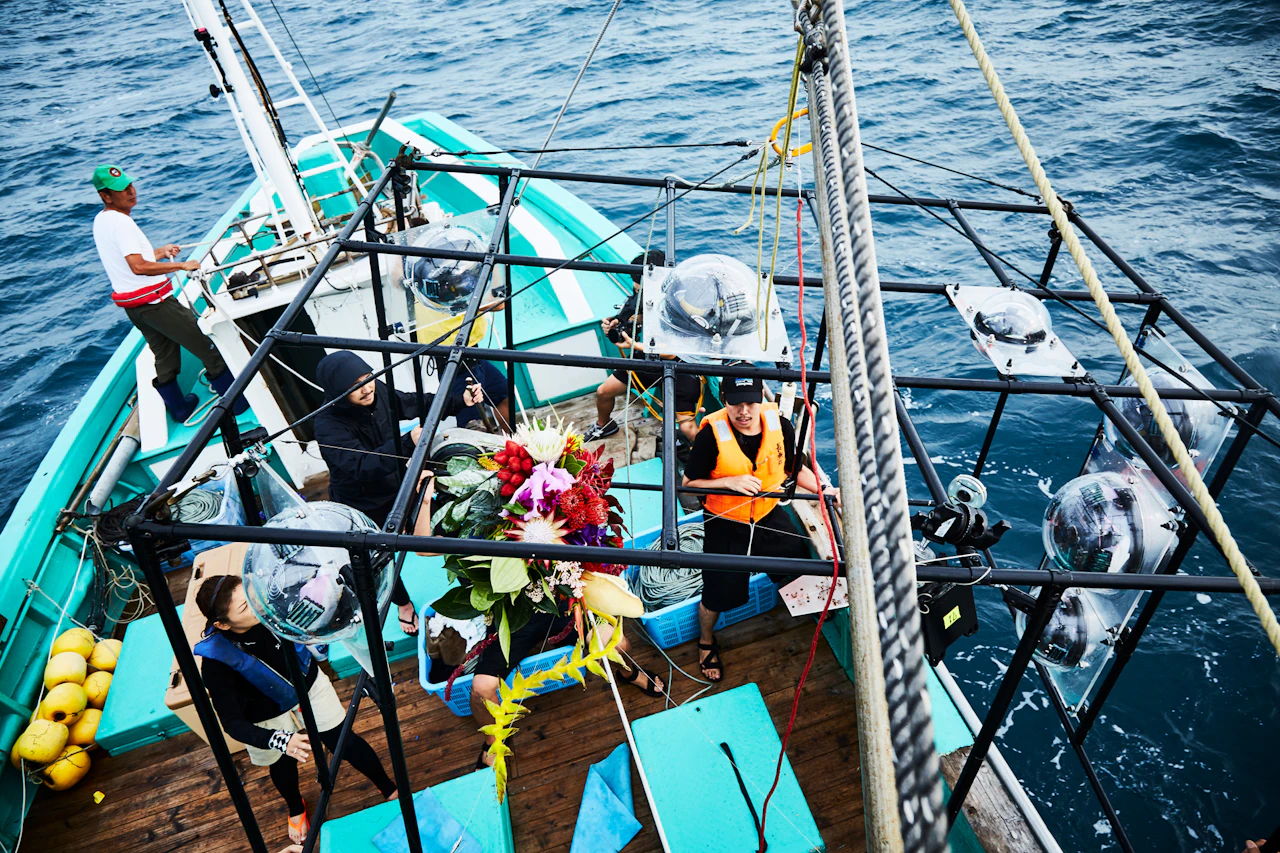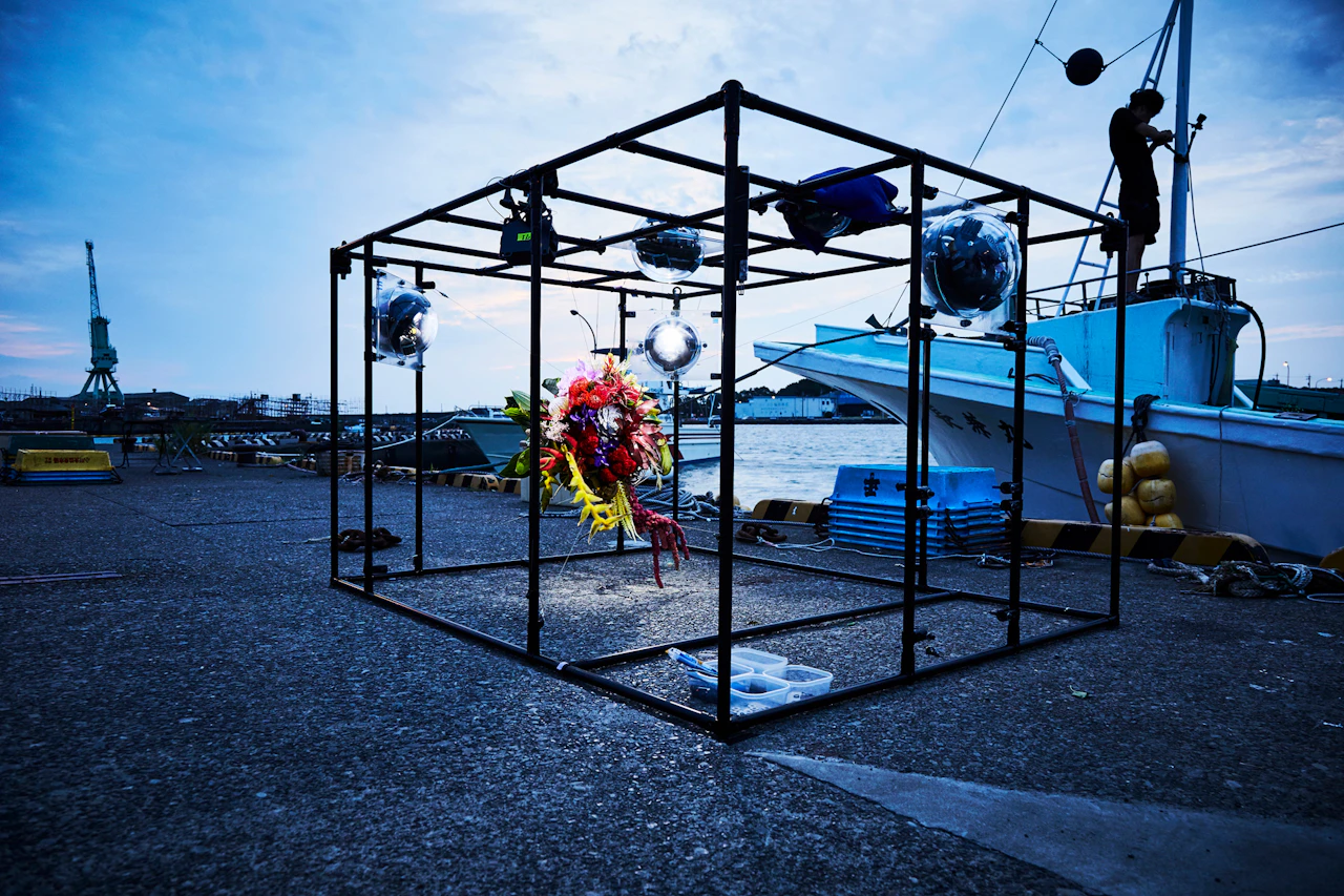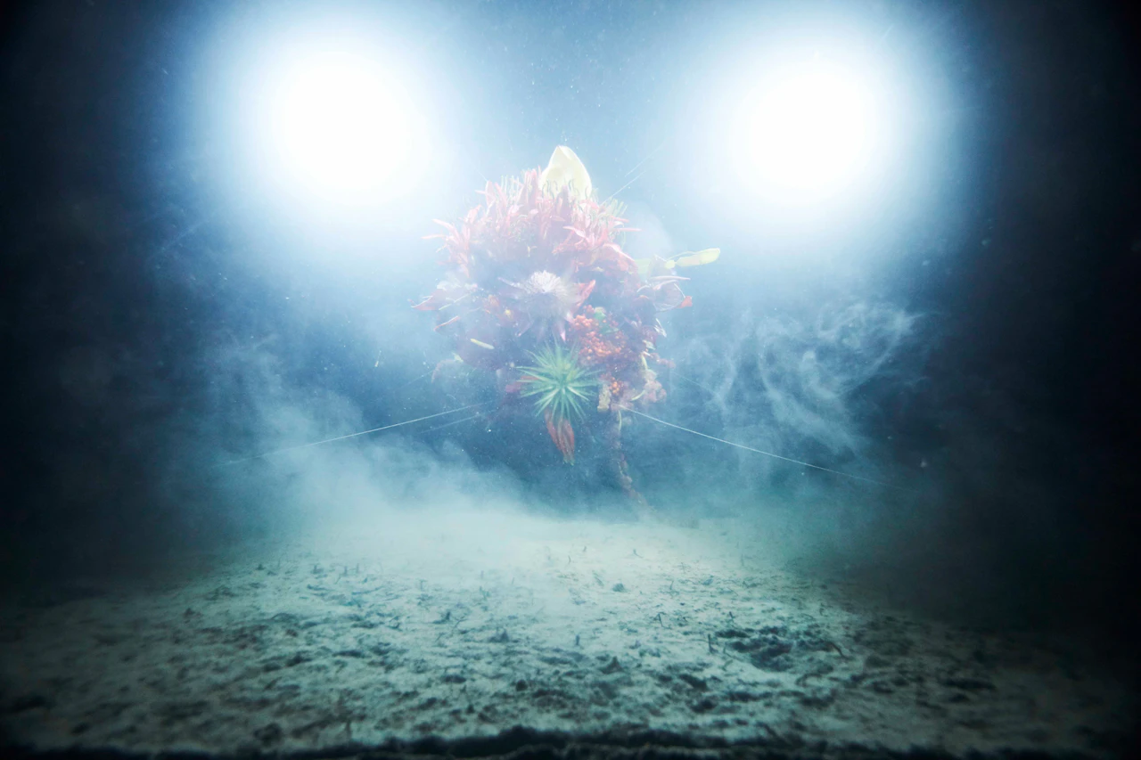 For the third project in the 'In Bloom' series, in which flowers are placed in unnatural situations, Azuma sank bouquets of around 100 different types of flower into the waters of Suruga Bay, Shizuoka Prefecture, at a depth of 1,000 metres. A remotely operated deep-sea exploration vehicle tracked the flowers underwater. Despite the high water pressure, the flowers largely retained their shapes; in fact, being underwater actually emphasized their forms. When brought back to the surface, the flowers had intensified in colour and hardened like plastic.