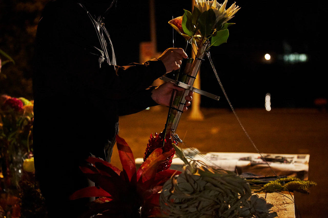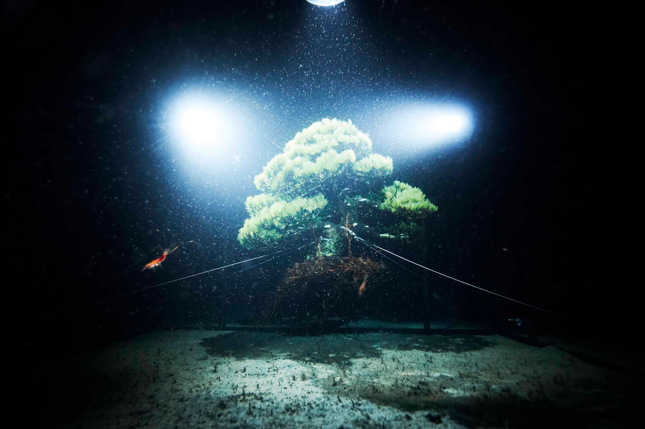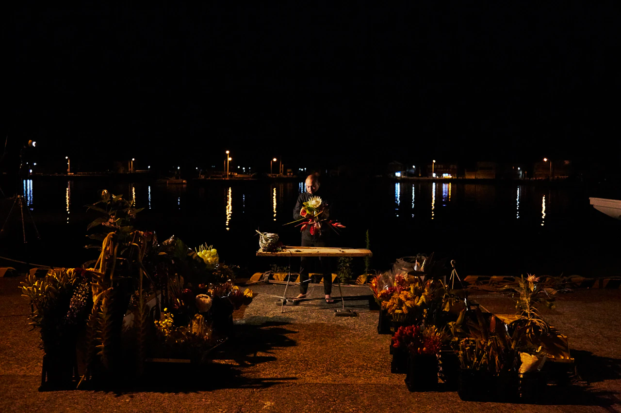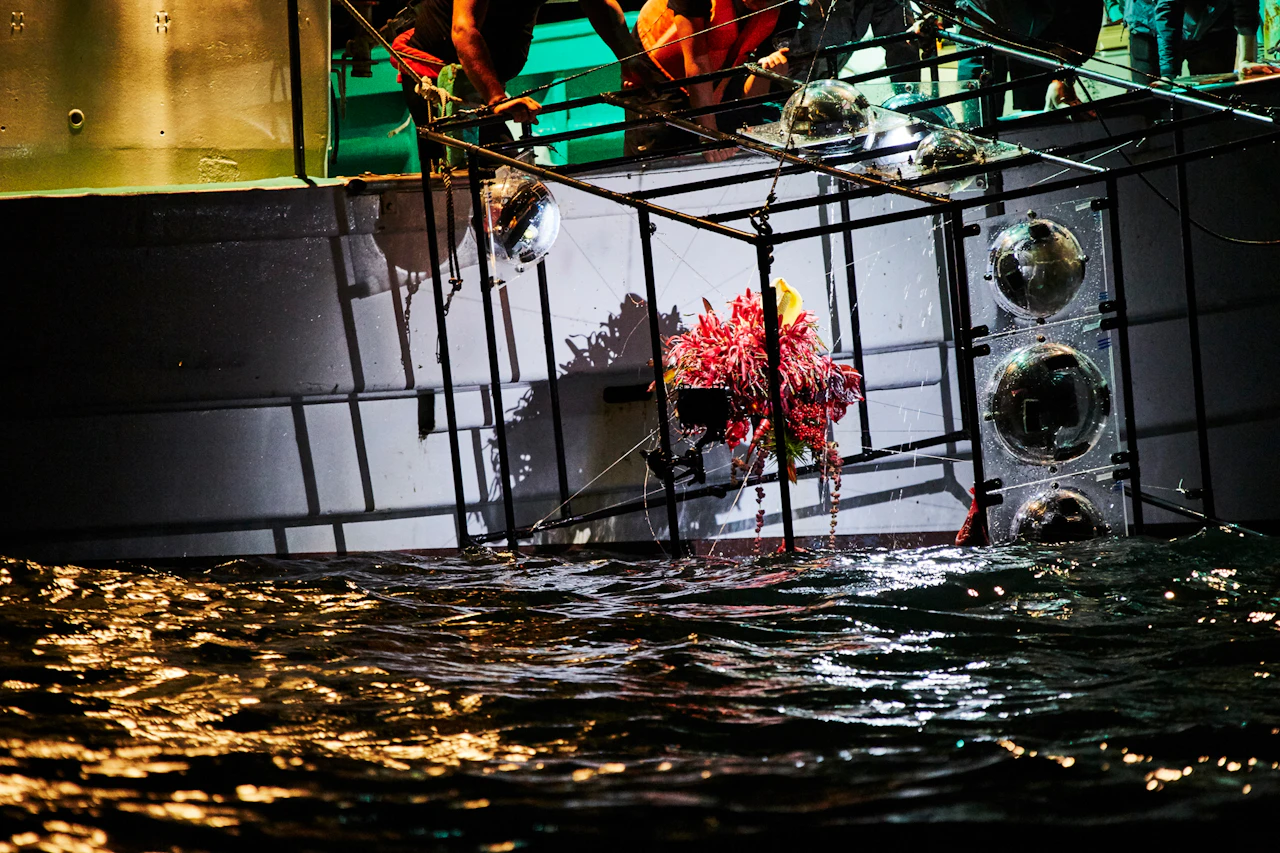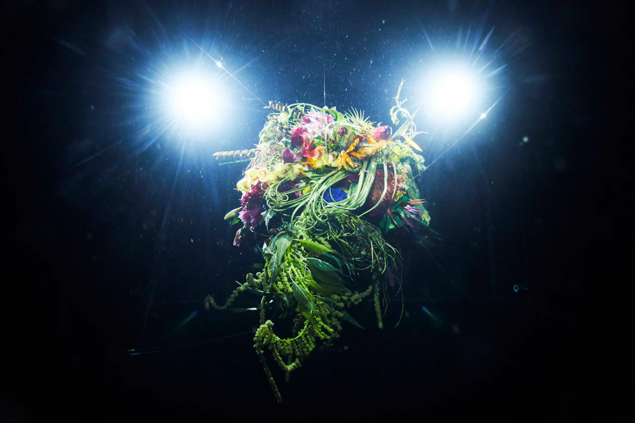 For the third project in the 'In Bloom' series, in which flowers are placed in unnatural situations, Azuma sank bouquets of around 100 different types of flower into the waters of Suruga Bay, Shizuoka Prefecture, at a depth of 1,000 metres. A remotely operated deep-sea exploration vehicle tracked the flowers underwater. Despite the high water pressure, the flowers largely retained their shapes; in fact, being underwater actually emphasized their forms. When brought back to the surface, the flowers had intensified in colour and hardened like plastic.