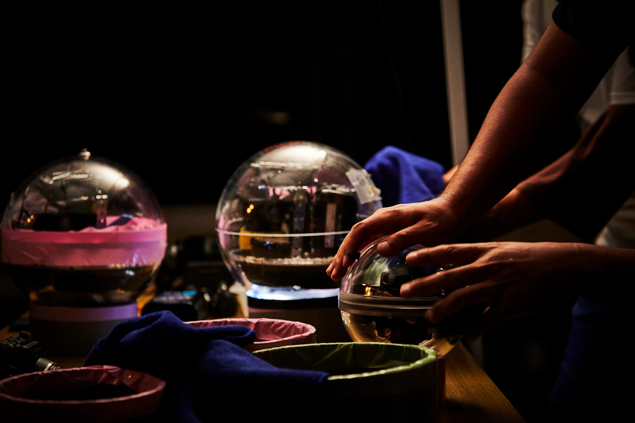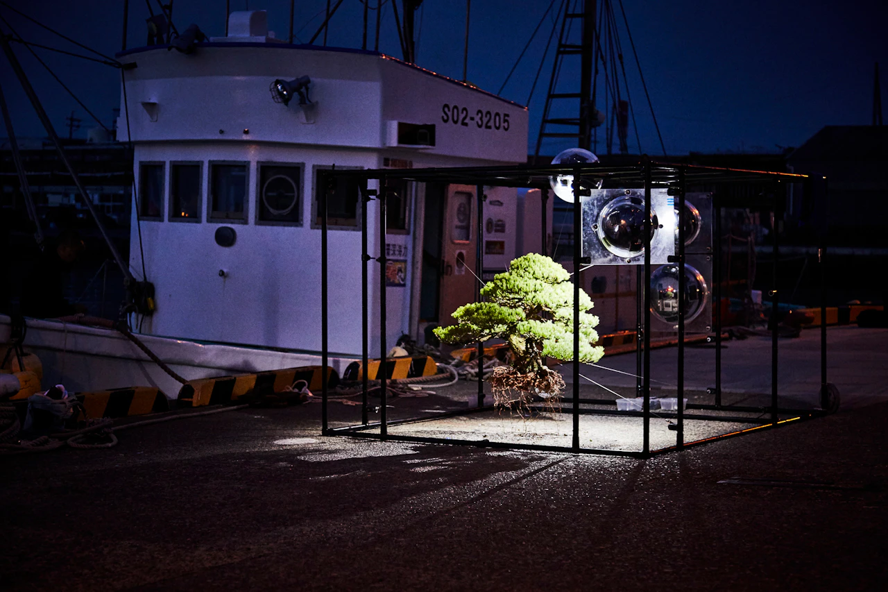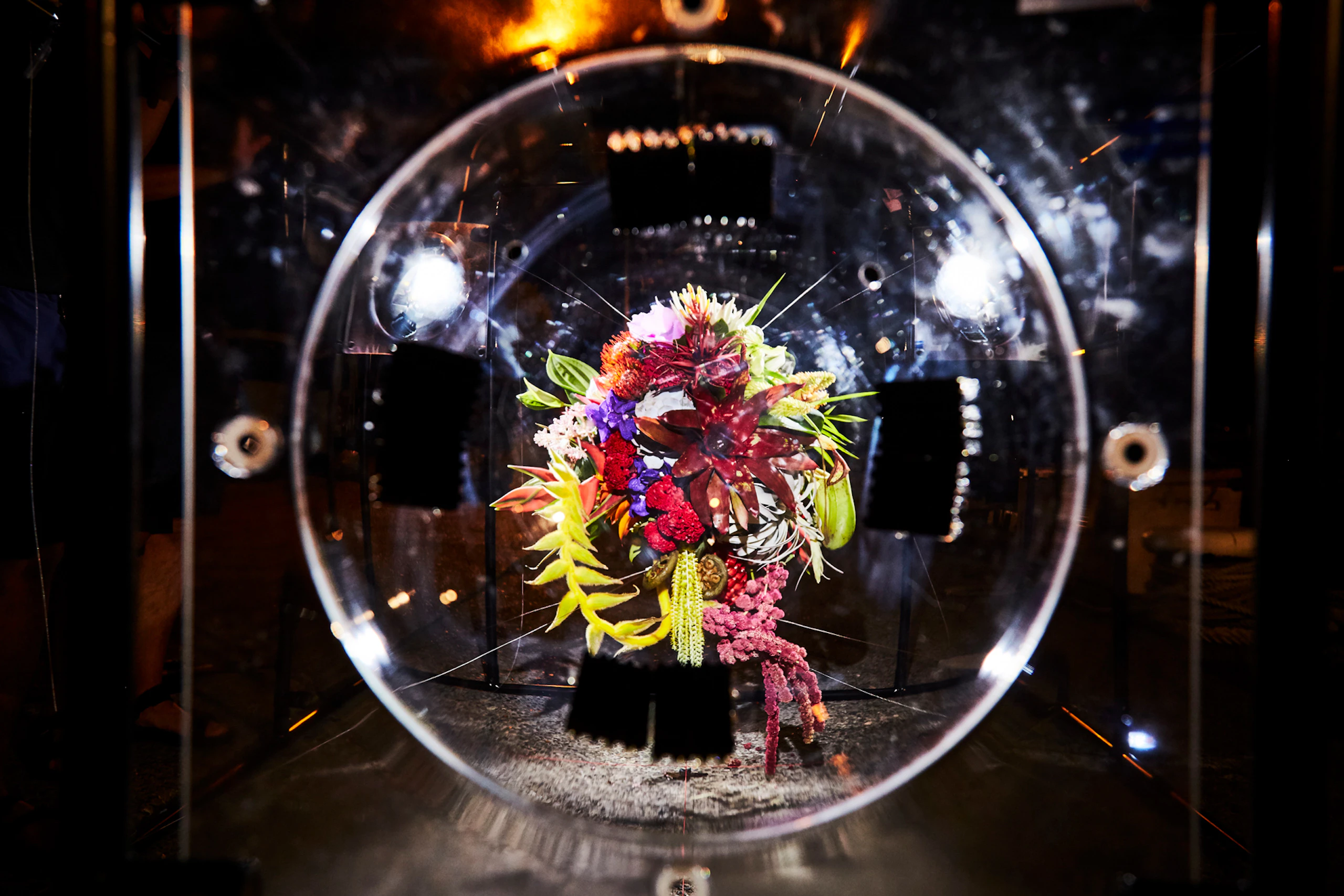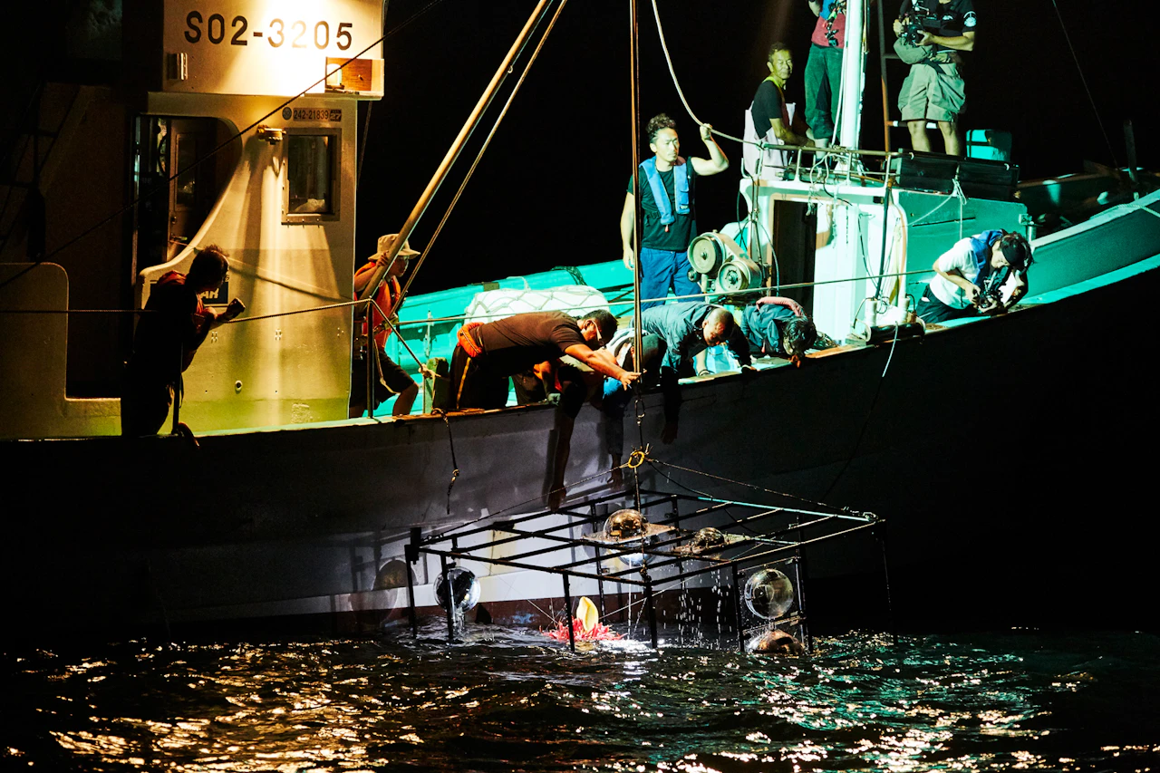 For the third project in the 'In Bloom' series, in which flowers are placed in unnatural situations, Azuma sank bouquets of around 100 different types of flower into the waters of Suruga Bay, Shizuoka Prefecture, at a depth of 1,000 metres. A remotely operated deep-sea exploration vehicle tracked the flowers underwater. Despite the high water pressure, the flowers largely retained their shapes; in fact, being underwater actually emphasized their forms. When brought back to the surface, the flowers had intensified in colour and hardened like plastic.