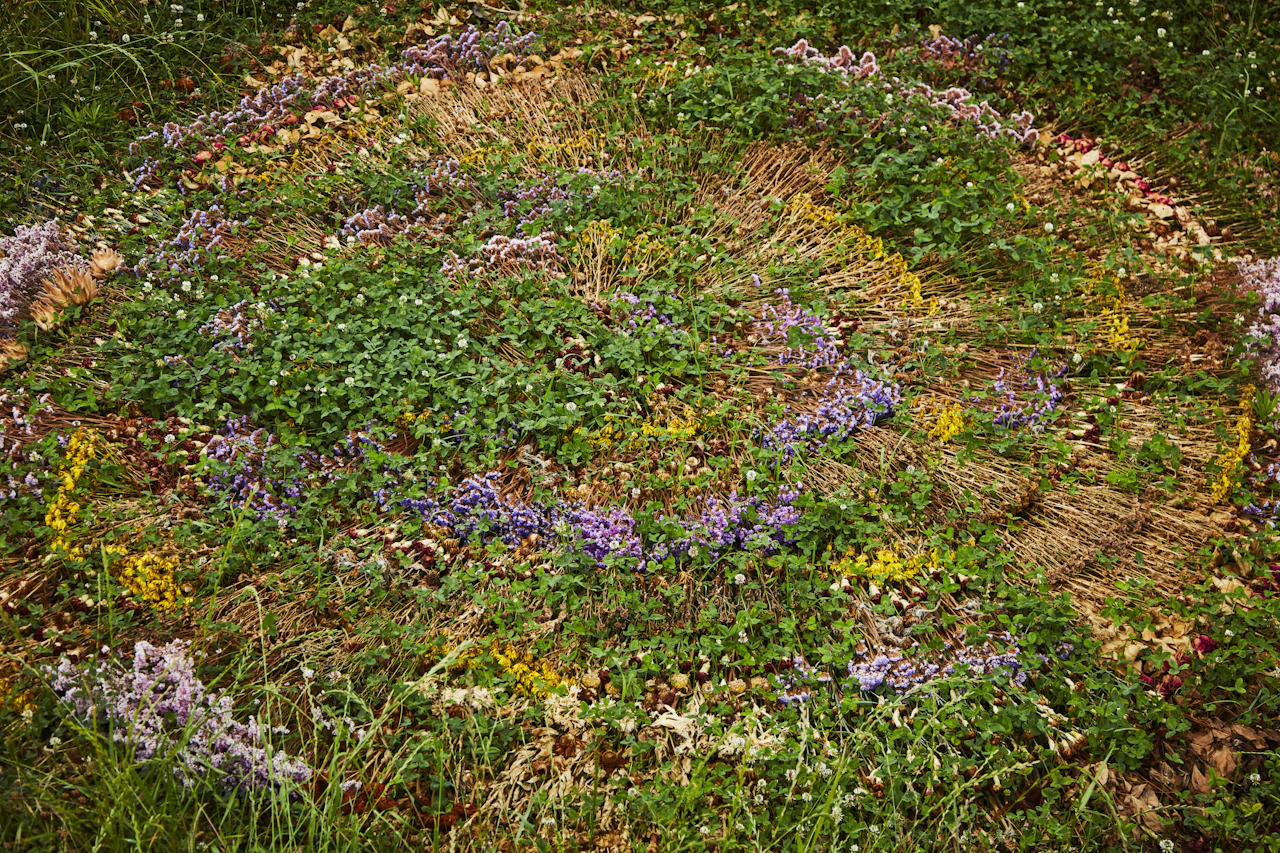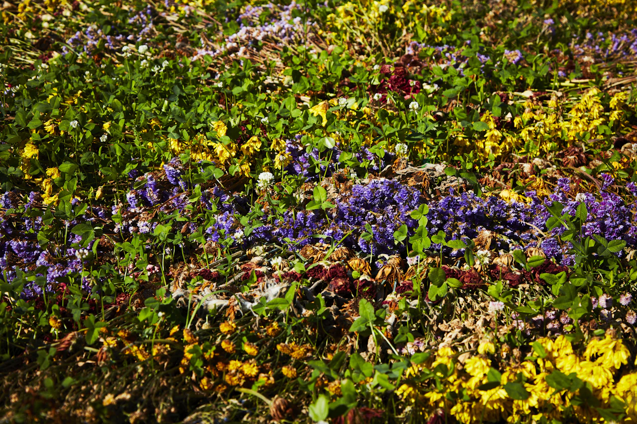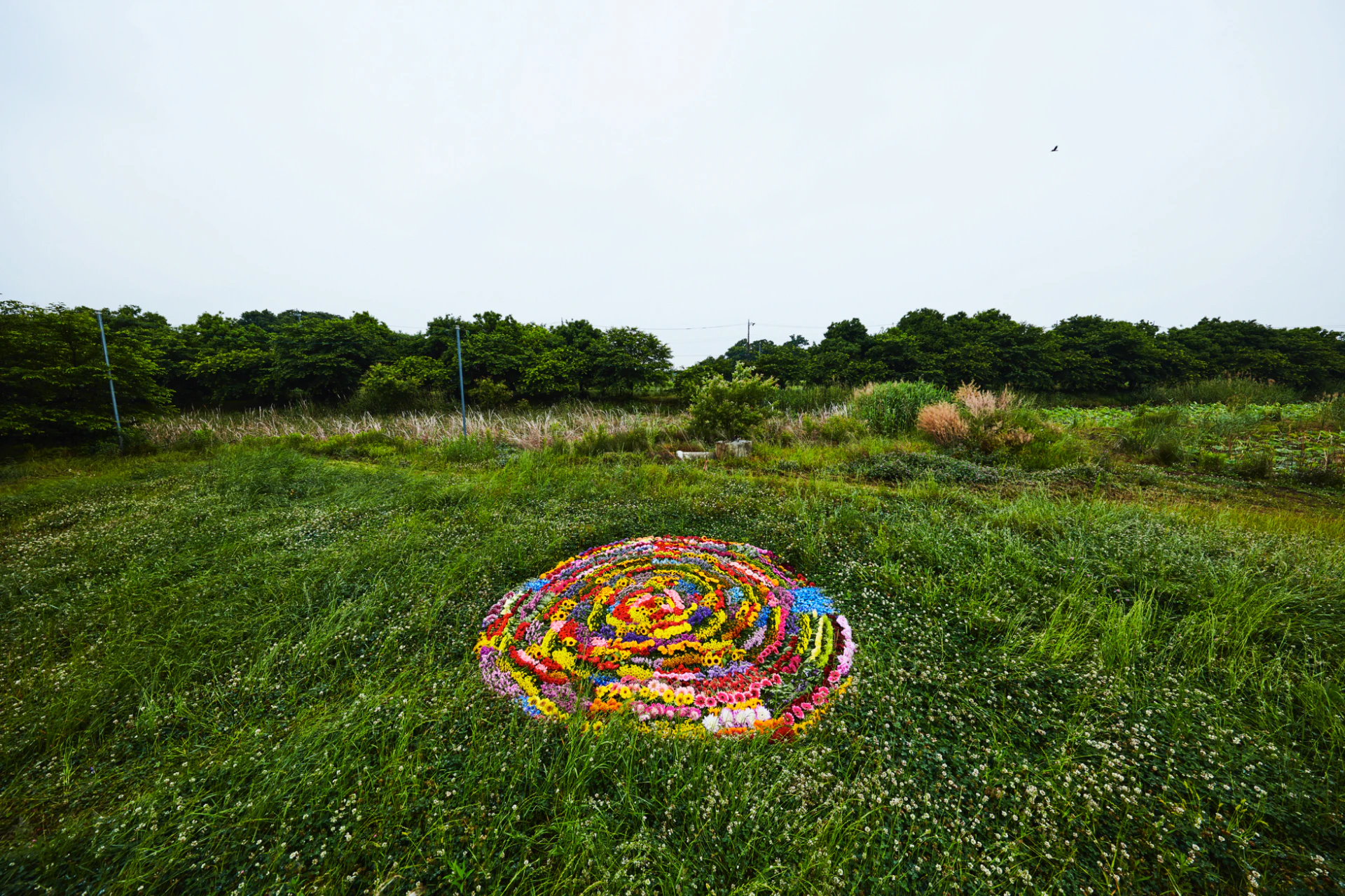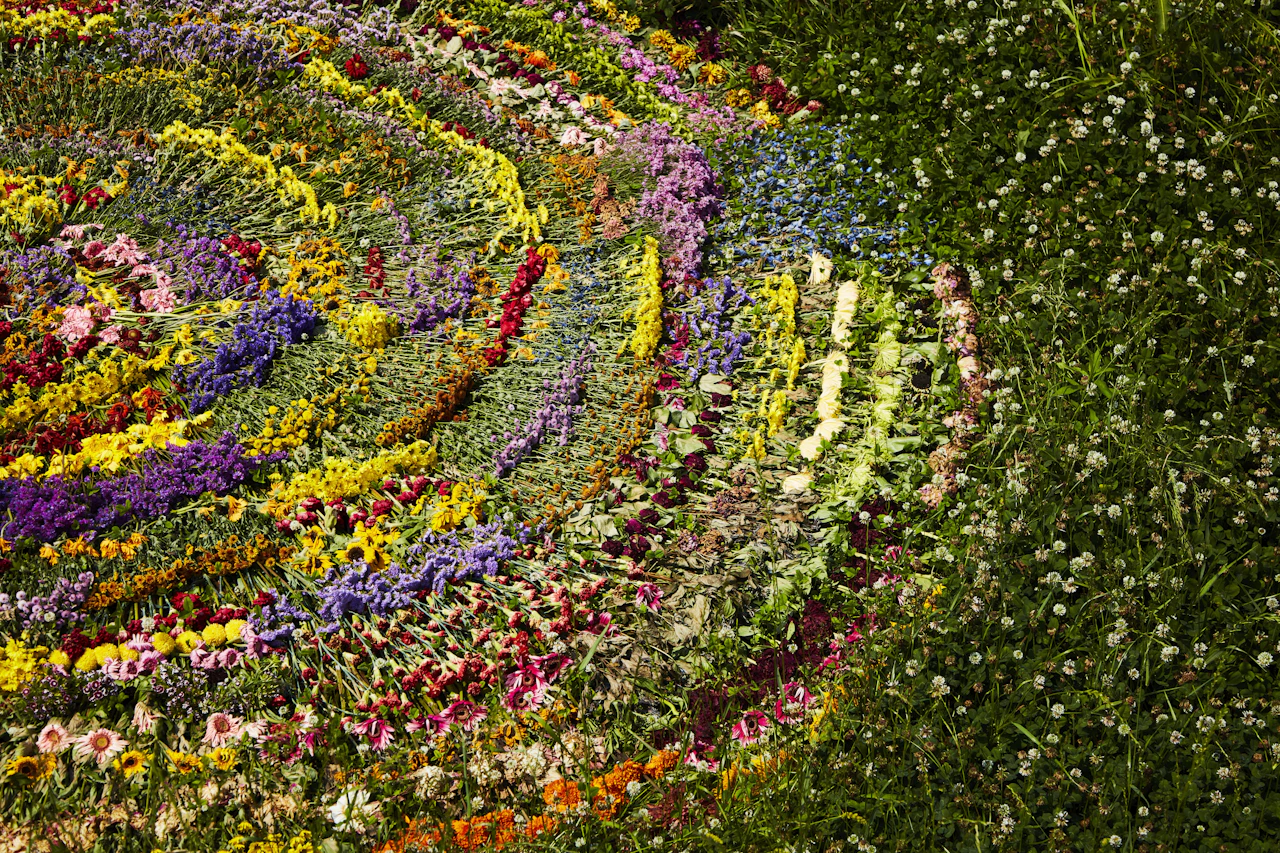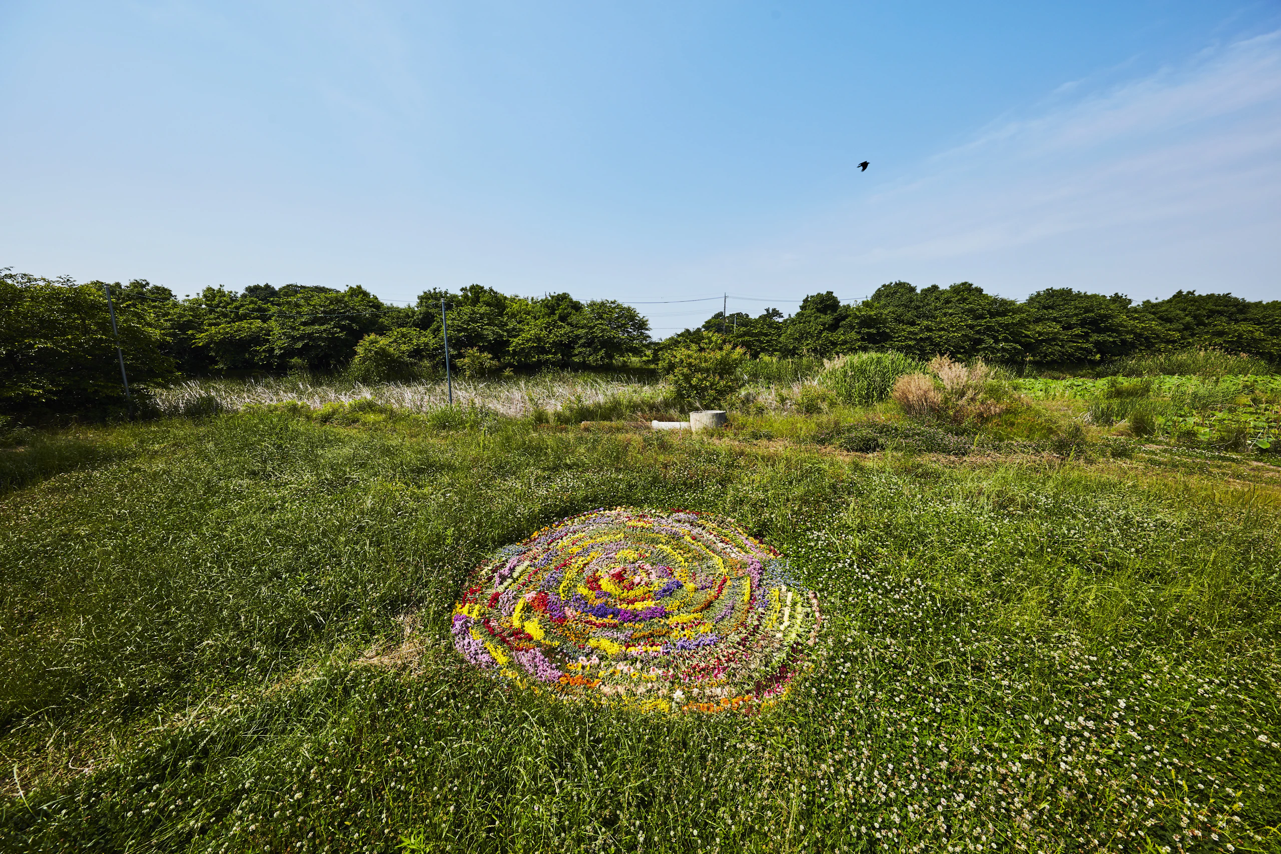 1万本のひまわり、バラ、その他色とりどりの花々によって、青々とした芝生の上に直径2mの輪が制作さてた。太陽、風、雨にさらされたこの屋外ディスプレイは、日ごとに変化し、色が褪せ、円の形が崩れた。2017年5月24日に設置され、その変化を捉えた作品の記録写真によると、6月中旬には、花は草や土と同化するかのように土に還っていた。