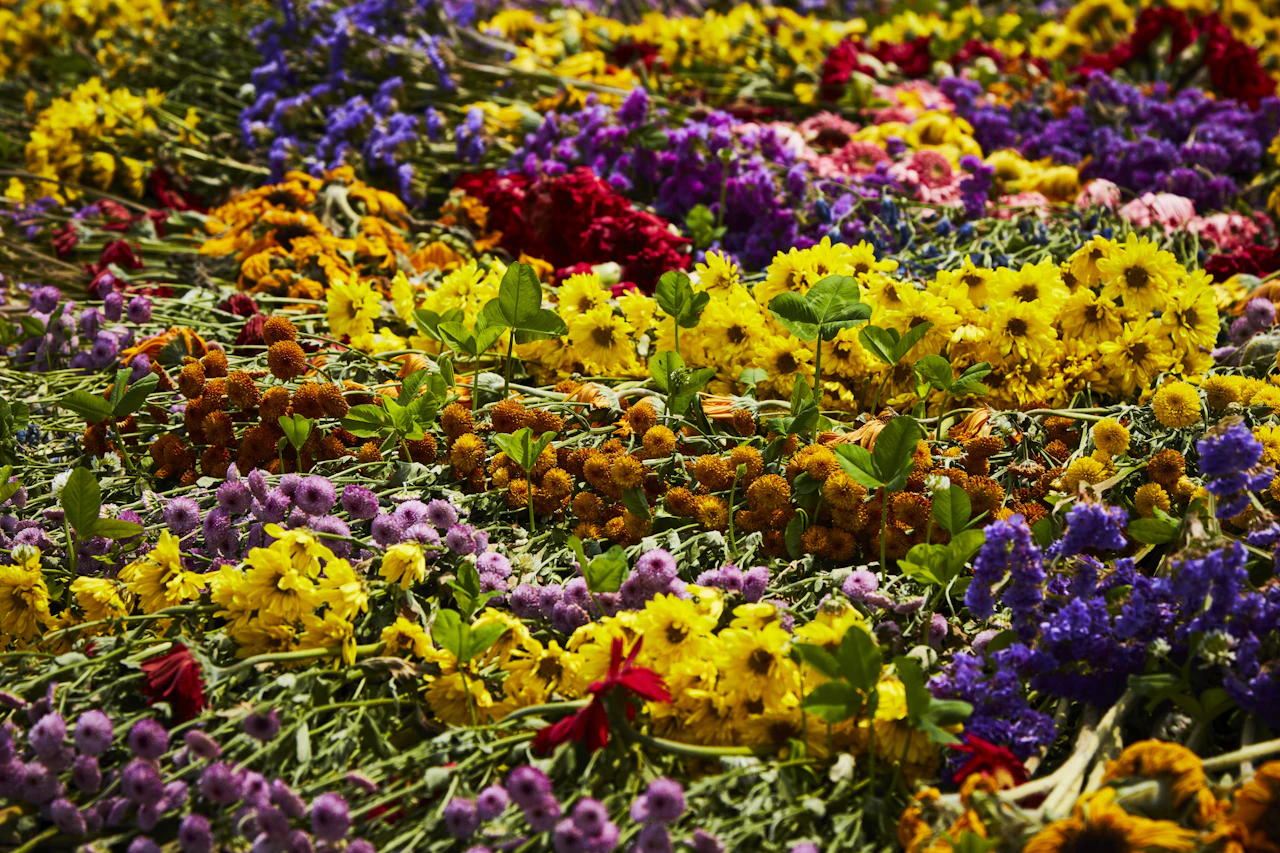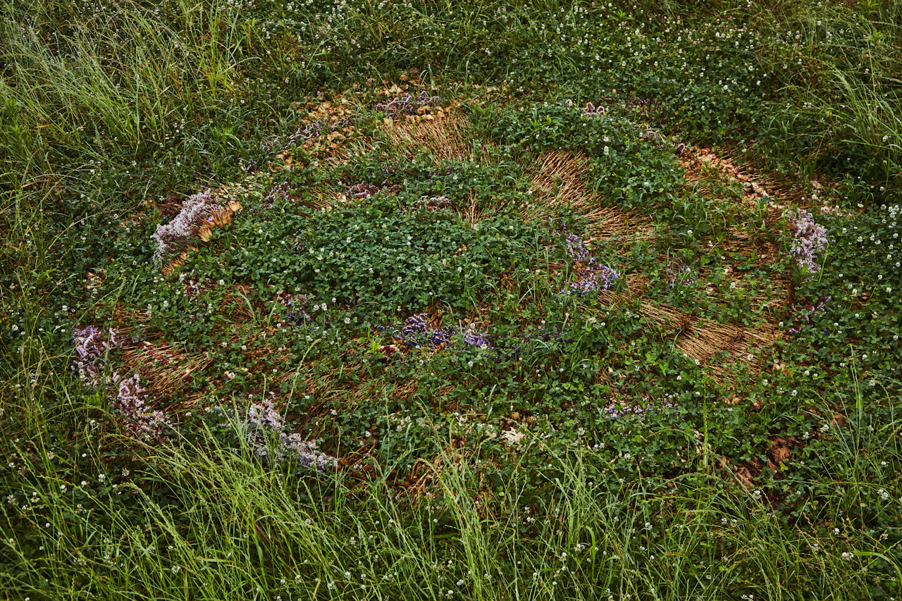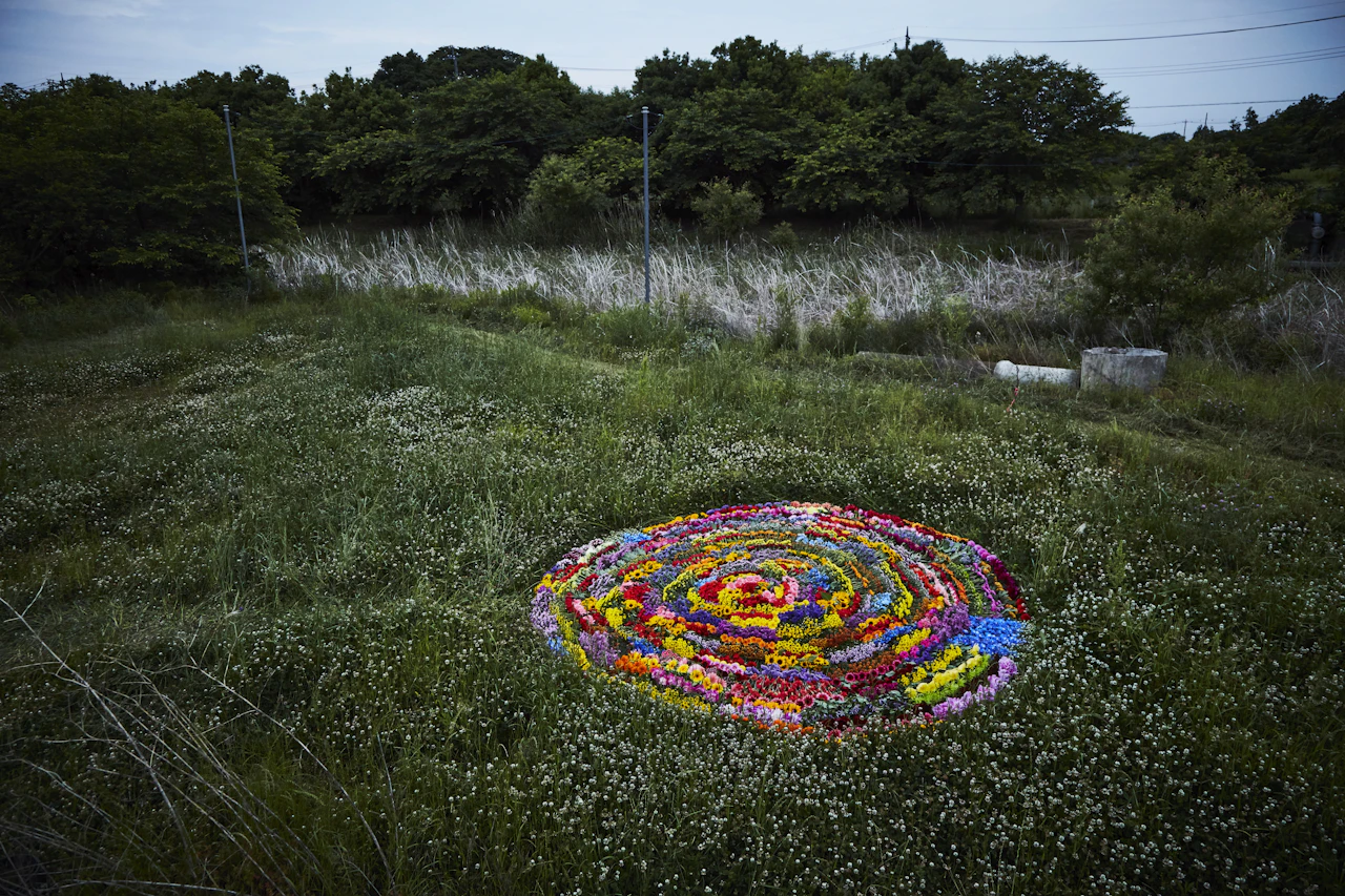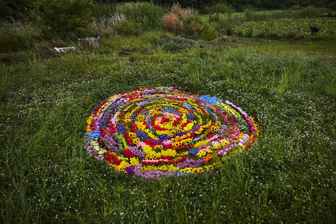 Ten thousand sunflowers, roses and other blooms in myriad hues were used to form a circle two metres in diameter on an expanse of lush grass. Exposed to sun, wind and rain, this outdoor display changed from day to day, its colours fading and the circle losing its shape. Installed on 24 May 2017, documentary photographs of the work capturing its transformation reveal that by o June, the flowers had returned to the earth, as if assimilating with the grass and soil on which they lay.